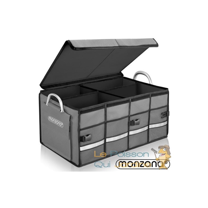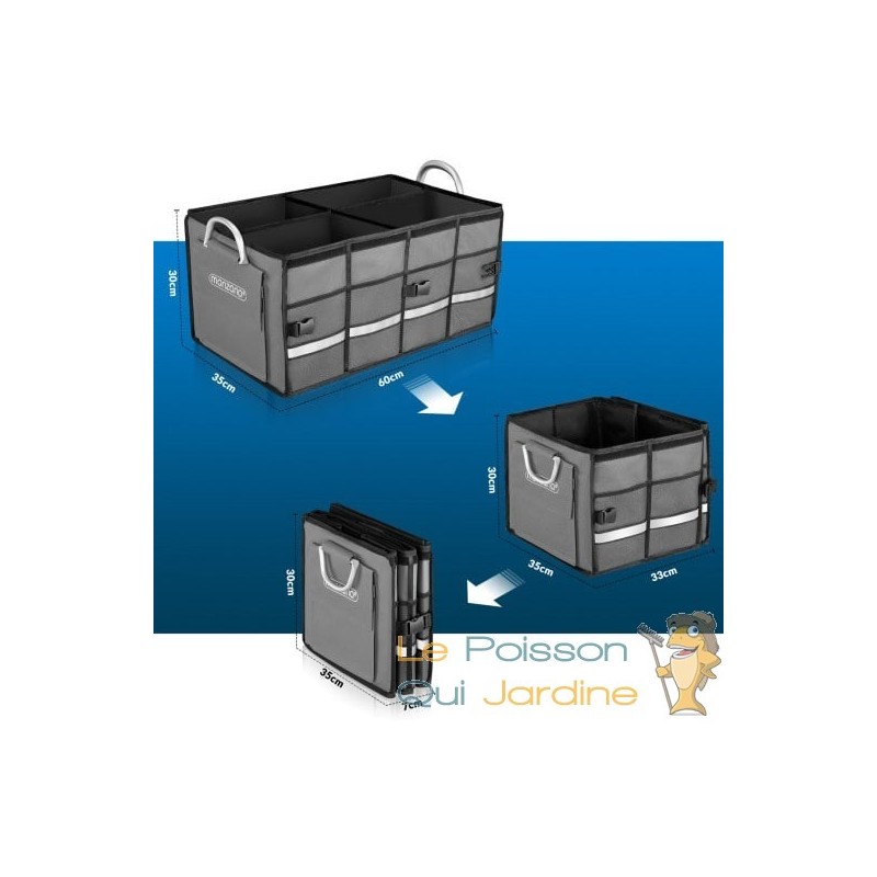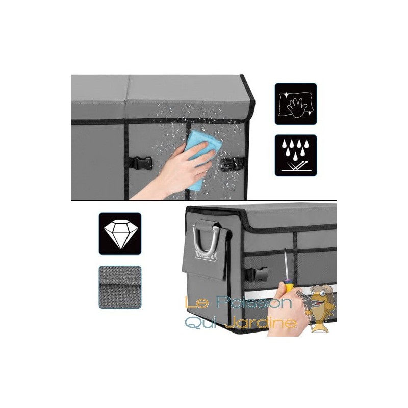 Cet organisateur de coffre est entièrement adaptable grâce à ses deux séparateurs internes et son couvercle amovible. Vous pouvez le réduire de moitié ou le plier entièrement en un clin d'œil grâce aux fermetures à clic.