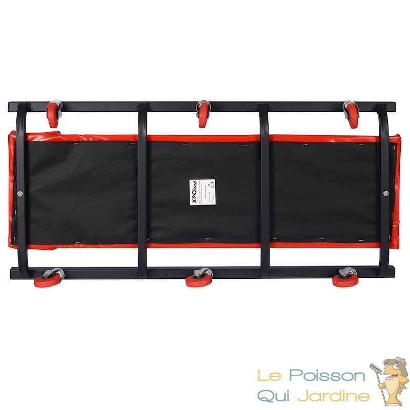 La stabilité du chariot est assurée par son cadre en acier durable, ce qui lui permet de supporter une charge maximale de 150 kg en toute sécurité. Les dimensions généreuses du chariot, mesurant 915 x 430 x 105 mm, avec des tubes de cadre de 25 x 25 mm, offrent une surface de travail adéquate pour diverses tâches d'entretien et de réparation. Disponible en couleur noire, ce chariot est également proposé en rouge et noir pour s'adapter à la préférence de l'utilisateur.
