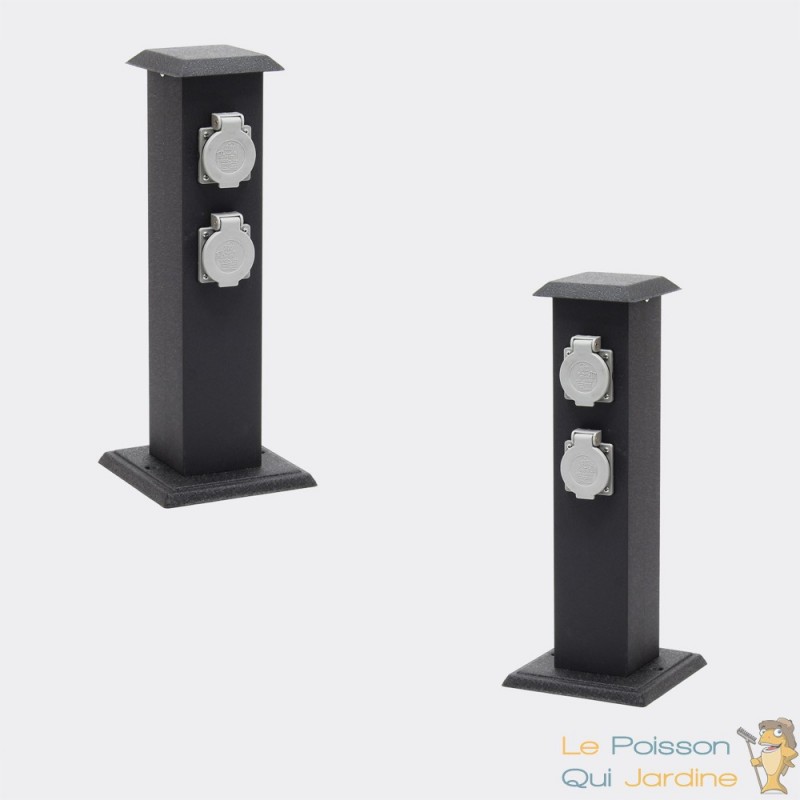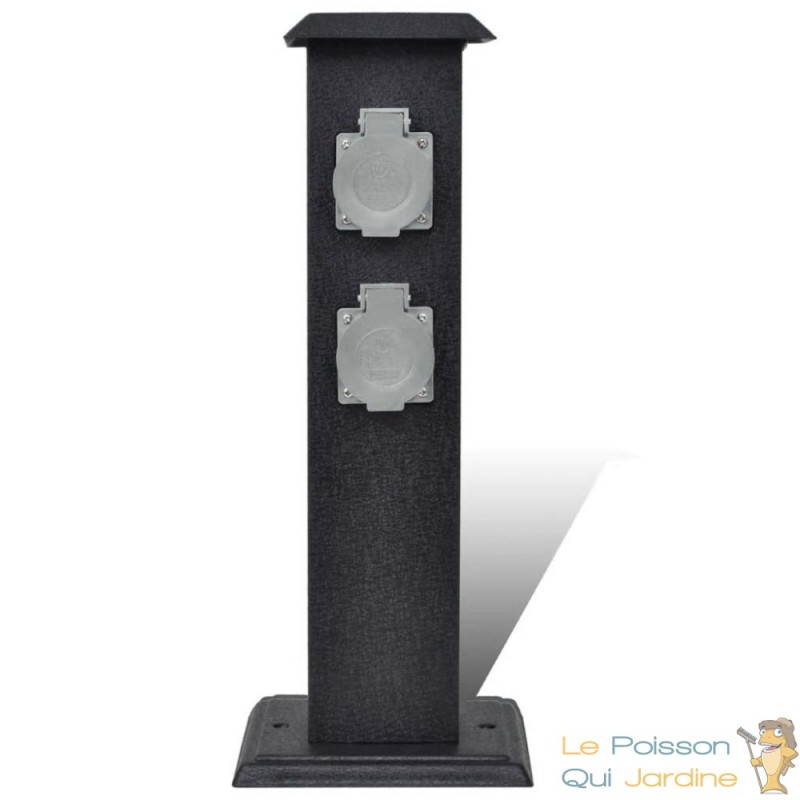 Ce dispositif se compose de deux colonnes noires équipées de 4 prises électriques chacune. Il est conçu pour faciliter le raccordement de divers appareils électriques en extérieur. Voici ses principales caractéristiques :