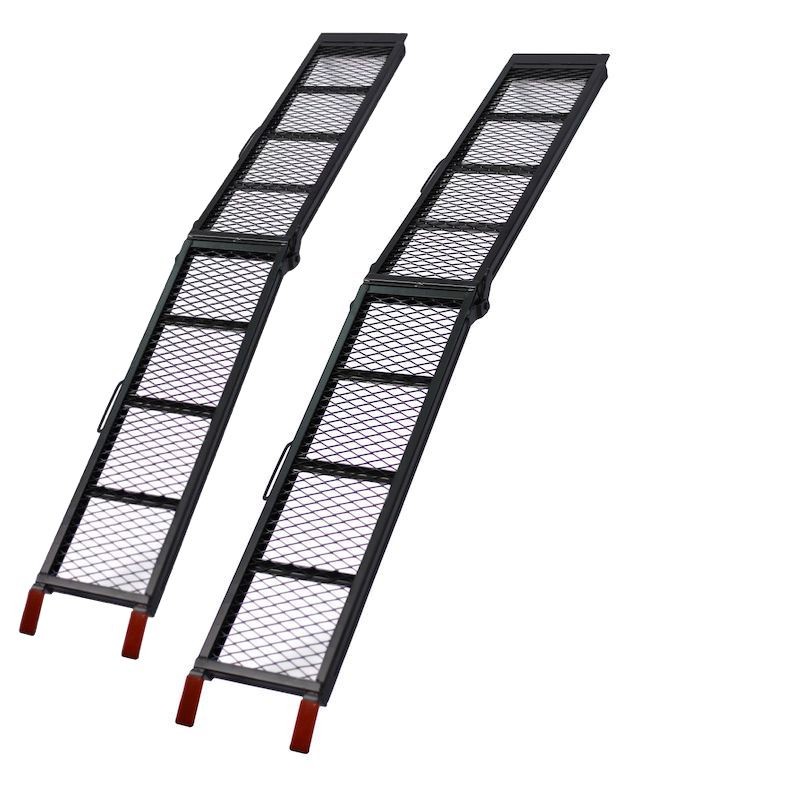 En mode replié, la rampe peut être utilisée pour franchir des marches plus basses, et une sangle incluse assure une fixation sécurisée pendant le transport. Fabriquée en acier revêtu de poudre noire, elle présente une surface supérieure en treillis métallique facile à nettoyer et offre une excellente adhérence. Sa capacité de charge maximale est de 340 kg, et elle peut atteindre une hauteur de contact maximale de 76 cm.