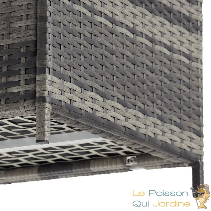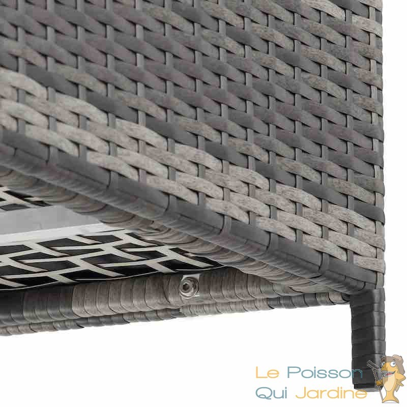Le tressage en poly-rotin résistant aux UV non seulement ajoute une touche esthétique, mais offre également une durabilité exceptionnelle, le rendant adapté à une utilisation en extérieur tout au long de l'année. La structure en aluminium légère et inoxydable garantit une stabilité solide et une résistance aux éléments.