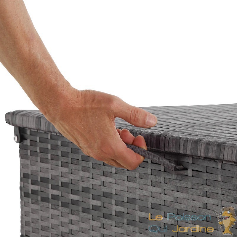 Le design du coffre est soigné, avec une finition en aluminium élégante qui s'intègre harmonieusement à n'importe quel environnement extérieur. Sa couleur neutre lui permet de se fondre facilement dans le décor de votre jardin, patio ou balcon, sans jurer avec le reste de votre aménagement.