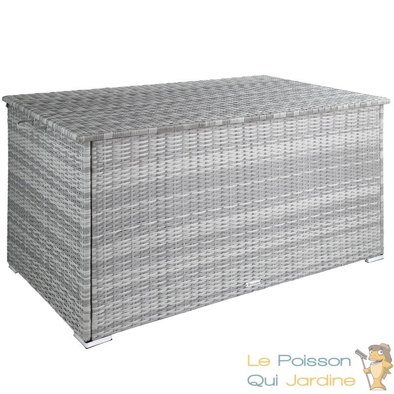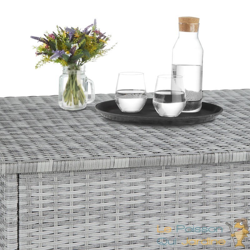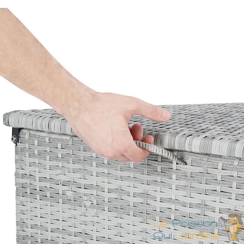 Le design du coffre est soigné, avec une finition en aluminium élégante qui s'intègre harmonieusement à n'importe quel environnement extérieur. Sa couleur neutre lui permet de se fondre facilement dans le décor de votre jardin, patio ou balcon, sans jurer avec le reste de votre aménagement.