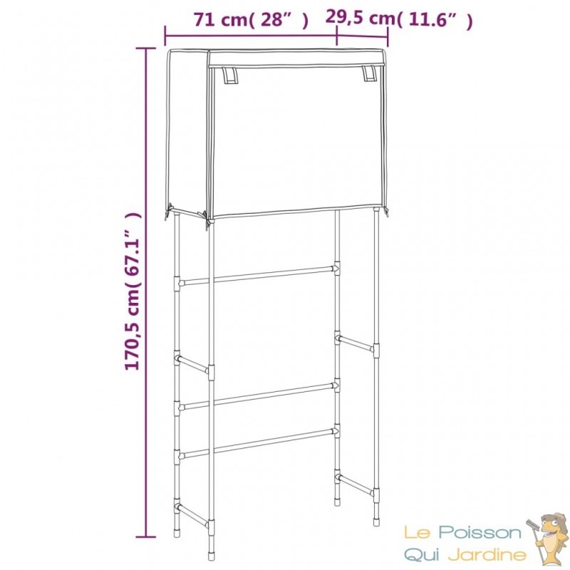 Avec une largeur de 71 cm et une hauteur totale de 170,5 cm, ce support est conçu pour enjamber la majorité des machines à laver standards à hublot ou à ouverture par le haut, tout en laissant un accès libre à l'appareil.