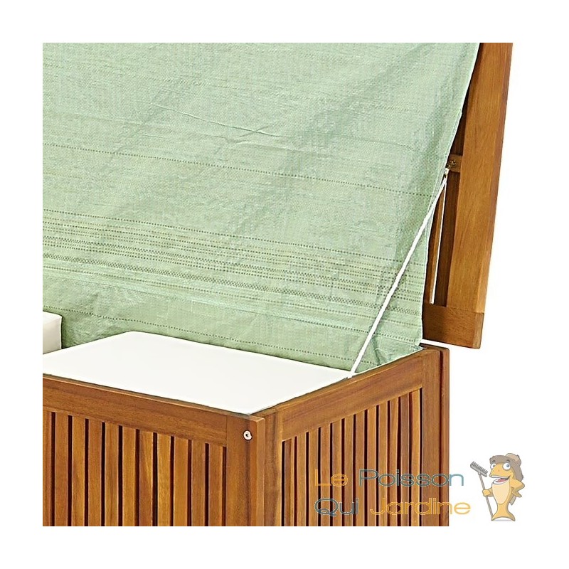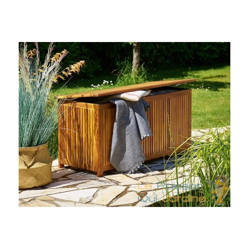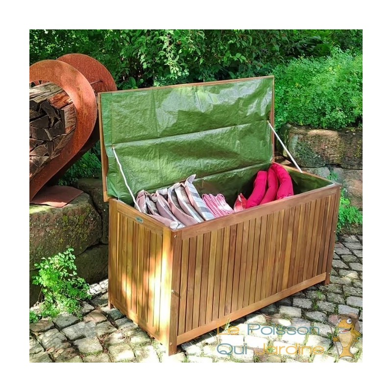 Le bois et les lattes permettent une ventilation naturelle. Bien que le rebord égouttant évacue l'eau de pluie, il est conseillé de placer le coffre dans un endroit relativement protégé pour une durabilité maximale du bois naturel.