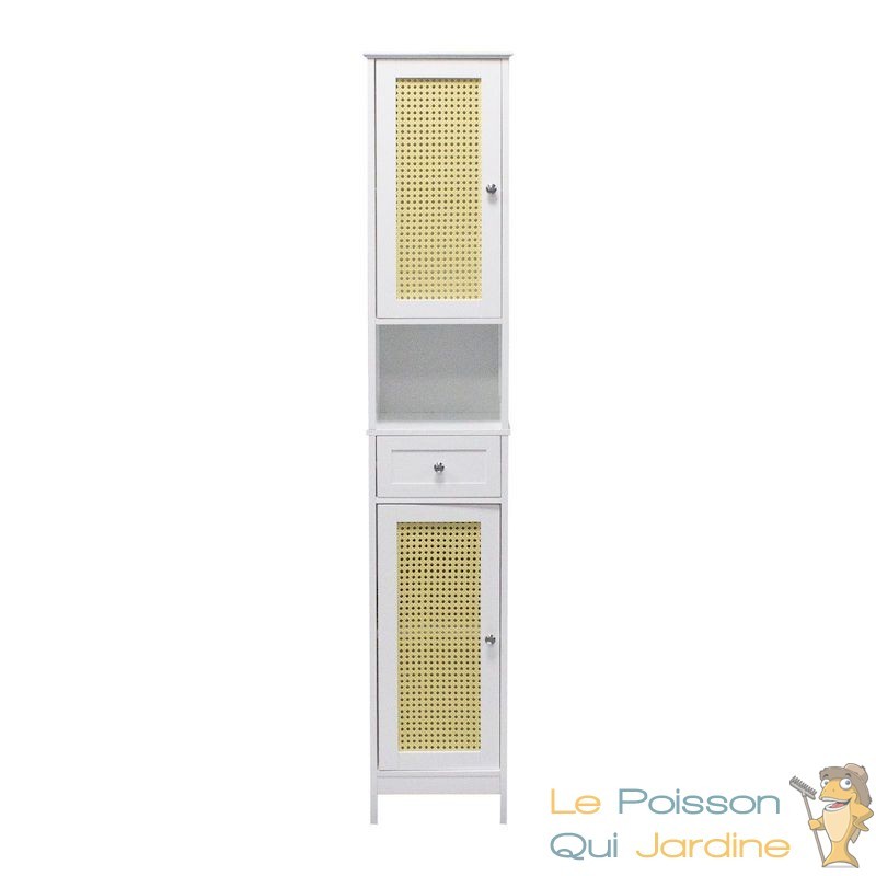Fabriquée en bois (MDF), cette armoire haute blanche ajoute une touche esthétique à votre salle de bains tout en offrant une solution de rangement pratique. En mettant de l'ordre dans votre salle de bains, vous créez un espace accueillant où vous pourrez vous détendre et vous préparer avec facilité.