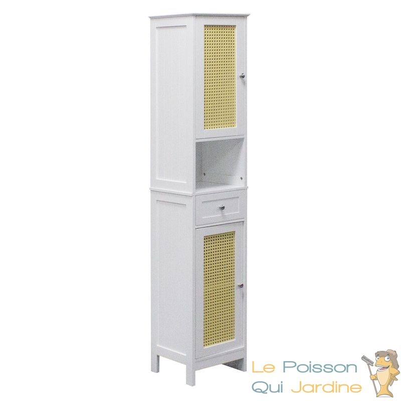 En résumé, l'armoire haute de salle de bains avec portes grillagées est non seulement esthétique, mais aussi fonctionnelle. Elle vous permet d'organiser vos produits de beauté et autres articles de salle de bains de manière pratique, tout en évitant l'humidité. C'est un ajout idéal pour créer une salle de bains bien rangée et accueillante.