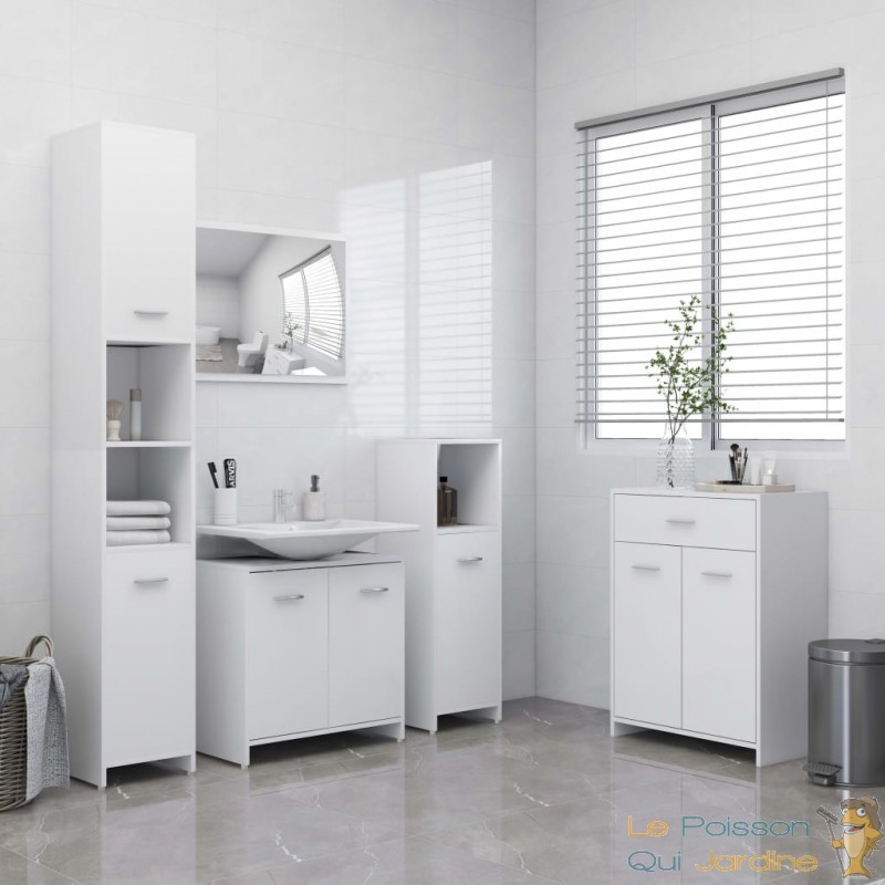 Armoire de Salle de Bain : Offrant un espace de rangement spacieux, cette armoire est parfaite pour organiser vos articles de toilette, serviettes et autres accessoires. Ses étagères réglables vous permettent de personnaliser l'espace en fonction de vos besoins.