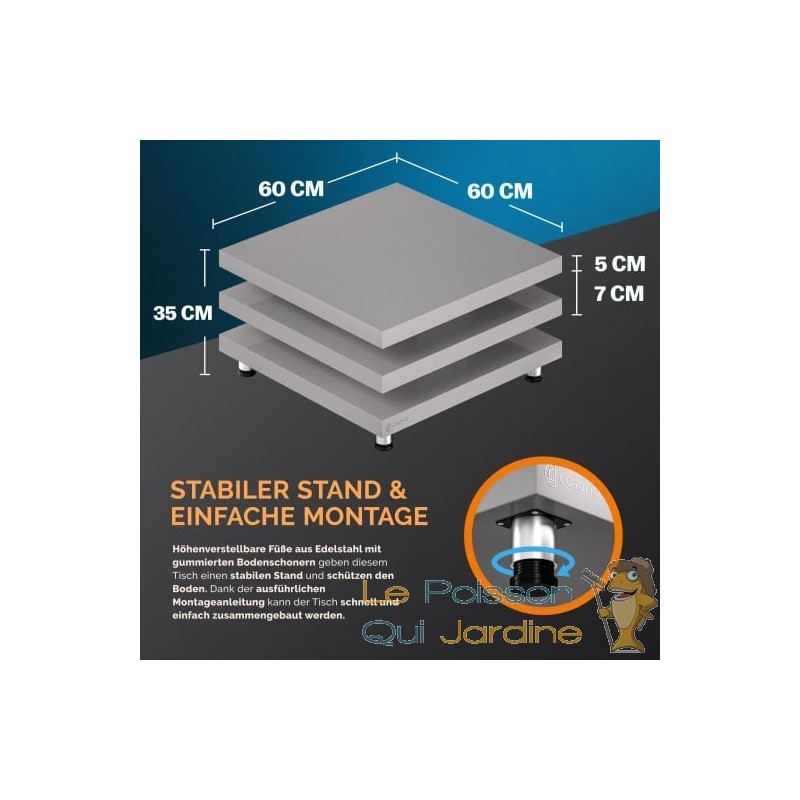 PRATIQUE ET ASSEMBLAGE FACILE Les pieds de la table, fabriqués en acier inoxydable, sont ajustables en hauteur et munis de patins en caoutchouc pour une stabilité optimale et une protection du sol. Le montage de la table est rapide et simple.