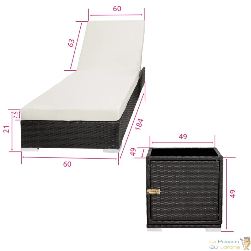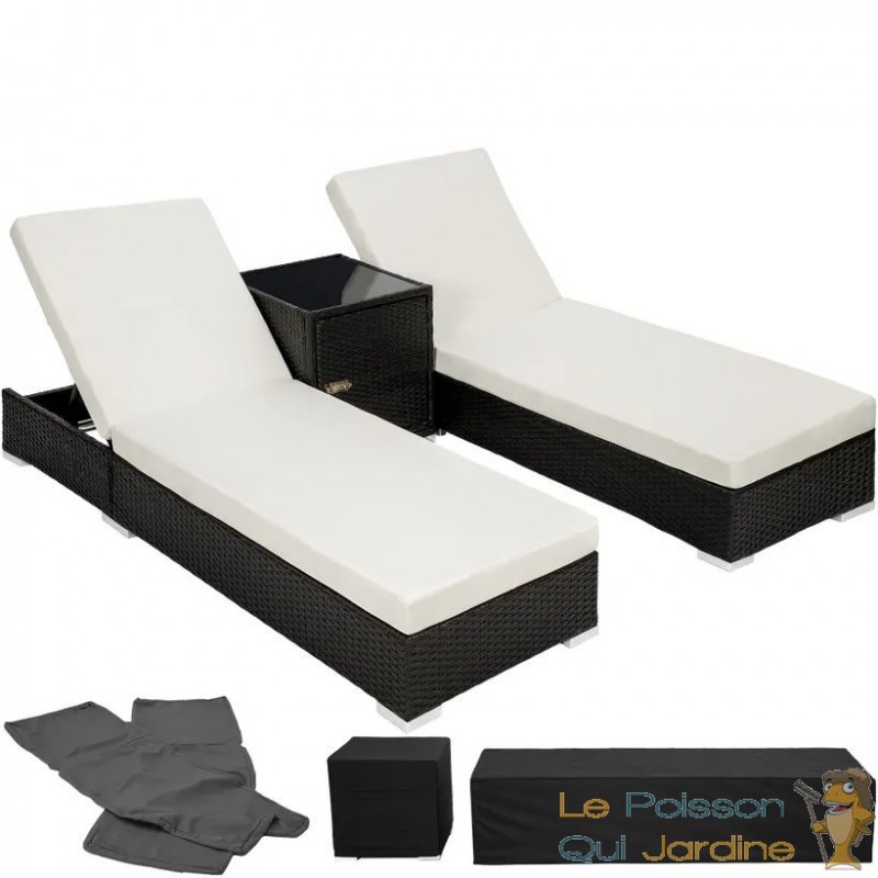 Ce bain de soleil est équipé d'une table intégrant un coffre de rangement pratique pour vos lunettes de soleil, boissons rafraîchissantes et crème solaire. La structure des chaises longues et de la table est en aluminium recouverte de résine tressée. Ce matériau, qui imite le rotin naturel, présente l'avantage d'être très léger et nécessite peu d'entretien. Il est donc idéal pour le mobilier de jardin, que ce soit sur votre terrasse, votre balcon ou près de votre piscine.