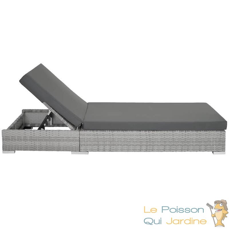 Ce bain de soleil se distingue par sa conception sophistiquée, offrant un espace de détente complet grâce à une table intégrée dotée d'un coffre de rangement pratique. Cette caractéristique astucieuse permet de garder à portée de main tous les accessoires indispensables pour profiter pleinement d'une journée en plein air. Que ce soit vos lunettes de soleil pour protéger vos yeux des rayons éclatants, des boissons rafraîchissantes pour étancher votre soif ou de la crème solaire pour protéger votre peau, ce coffre de rangement vous assure une organisation impeccable de vos effets personnels.