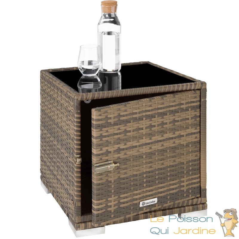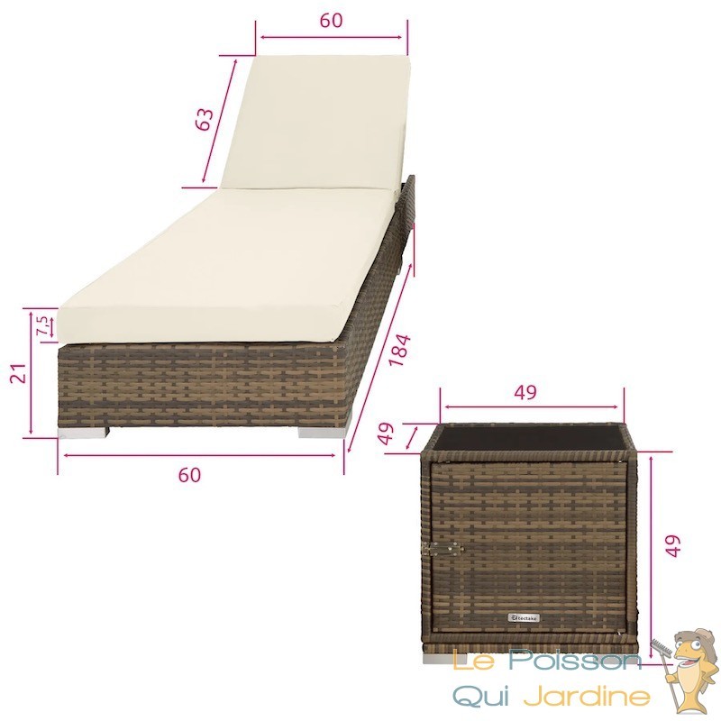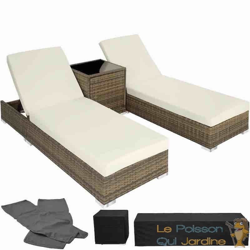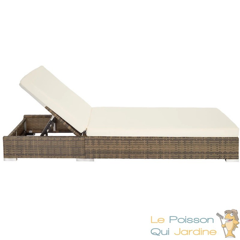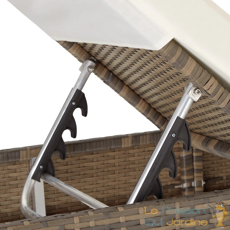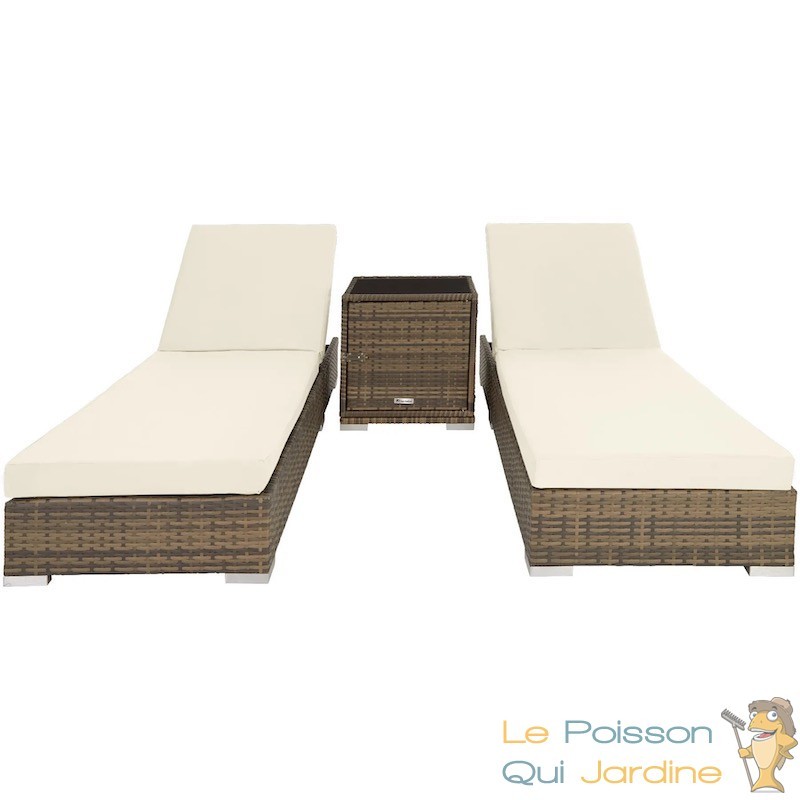 Ce bain de soleil est équipé d'une table intégrant un coffre de rangement pratique pour vos lunettes de soleil, boissons rafraîchissantes et crème solaire. La structure des chaises longues et de la table est en aluminium recouverte de résine tressée. Ce matériau, qui imite le rotin naturel, présente l'avantage d'être très léger et nécessite peu d'entretien. Il est donc idéal pour le mobilier de jardin, que ce soit sur votre terrasse, votre balcon ou près de votre piscine.