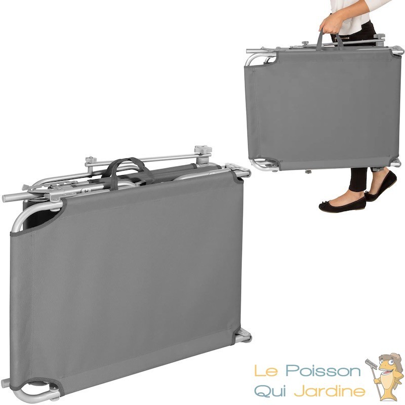 Dimensions pliées : Lorsqu'il est plié, le transat mesure environ 73 cm de longueur, 68 cm de largeur et 15 cm de hauteur. Sa conception compacte facilite son transport et son stockage lorsque vous ne l'utilisez pas.
