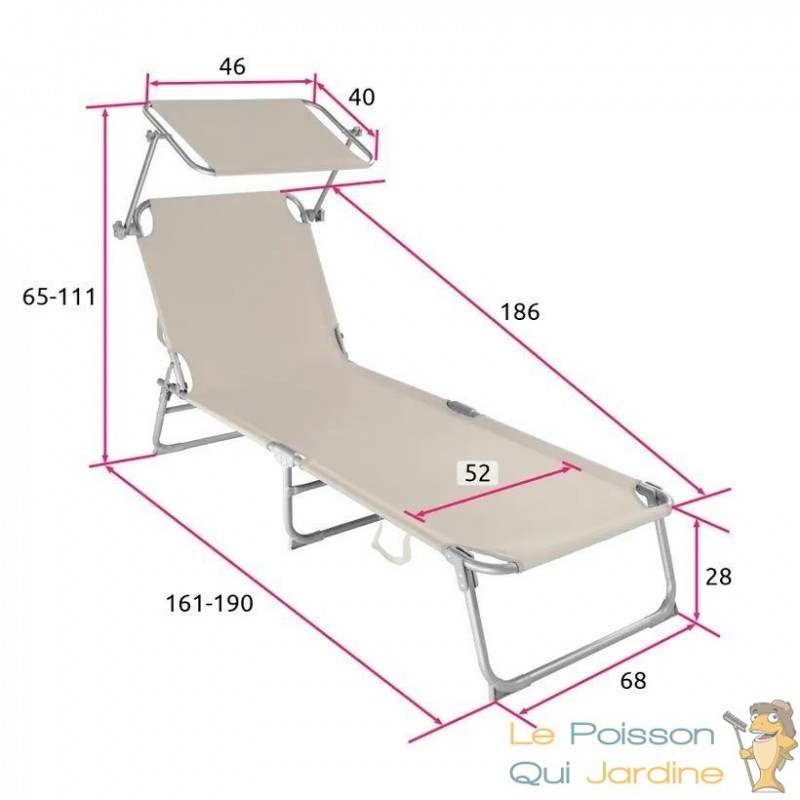 Dimensions totales : Le transat mesure environ 190 cm de longueur, 68 cm de largeur et 28 cm de hauteur. Ces dimensions généreuses vous permettent de vous allonger confortablement et de profiter pleinement de votre bain de soleil.