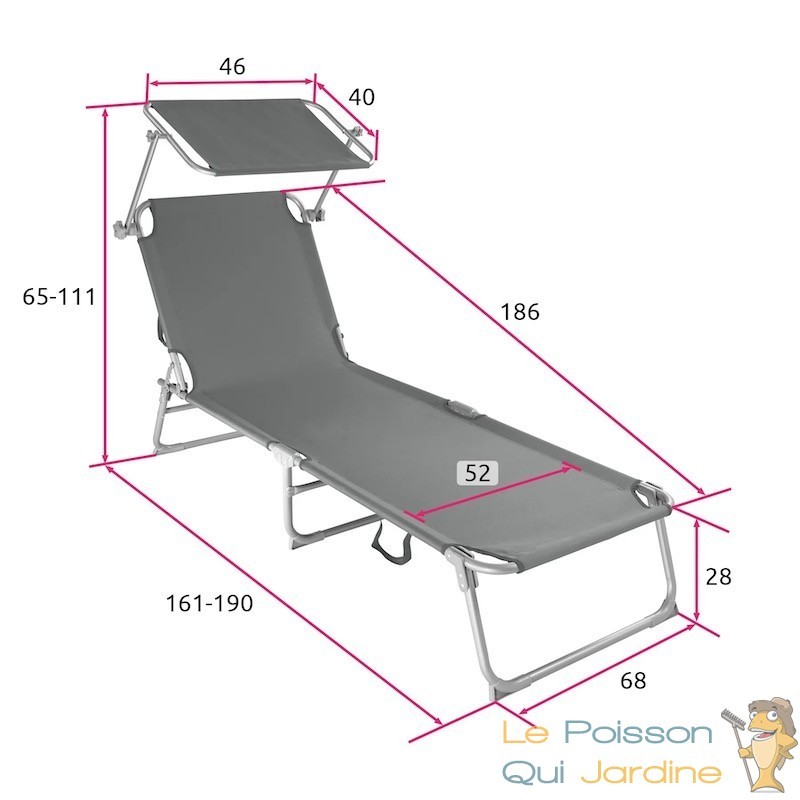 Surface de couchage : La surface de couchage du transat mesure environ 186 cm de longueur et 52 cm de largeur. Elle offre un espace spacieux pour vous détendre et vous reposer.