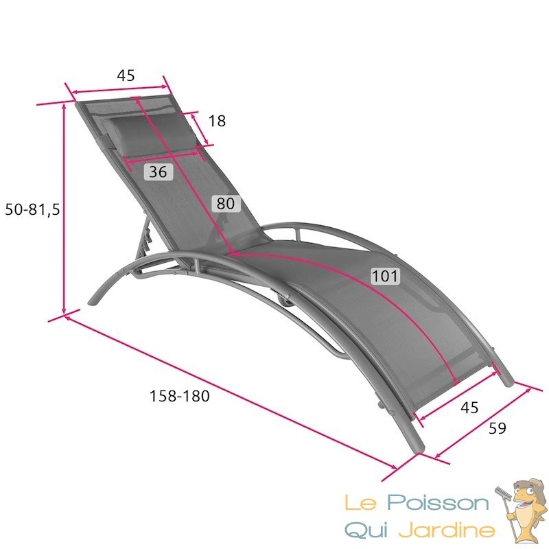 Les dimensions totales des transats varient selon leur position. En position la plus haute, les dimensions sont d'environ 59 x 158 x 81,5 cm, tandis qu'en position la plus basse, elles sont d'environ 59 x 180 x 50 cm. Les coussins de tête mesurent environ 36 x 5 x 18 cm. Les pieds antidérapants ont une largeur d'environ 5 cm.