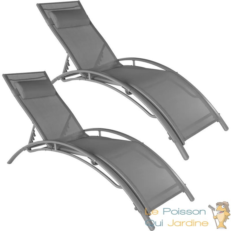 2 Transats ergonomiques acier gris. Une détente ultimes près de la piscine ou dans le jardin