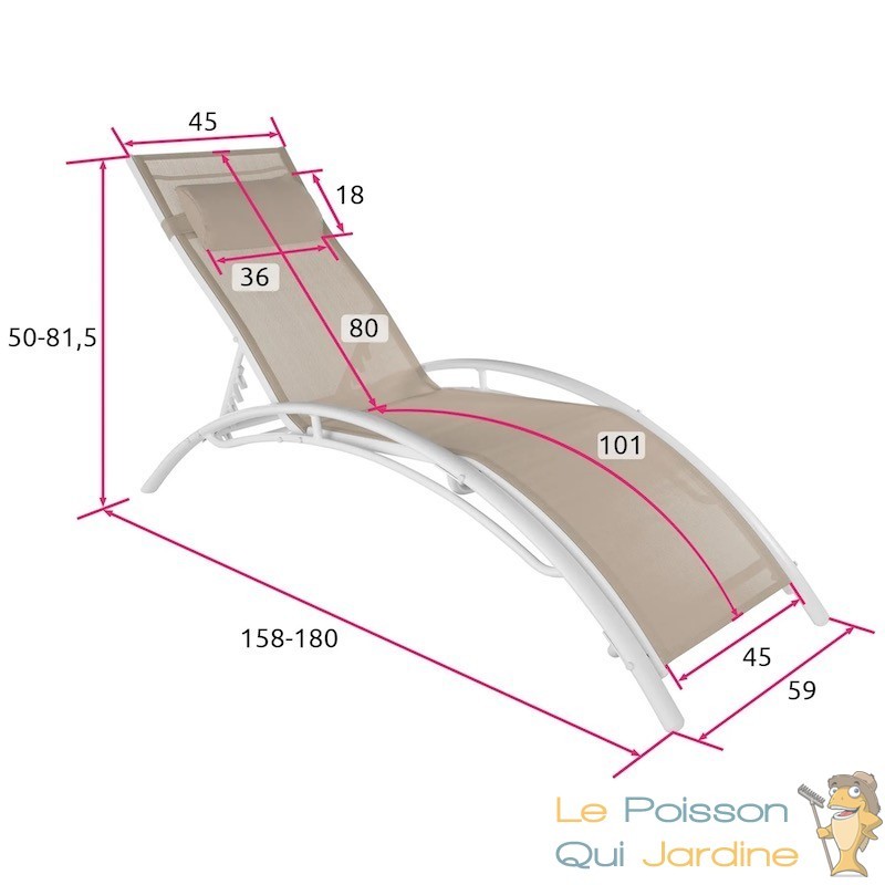Les dimensions totales des transats varient selon leur position. En position la plus haute, les dimensions sont d'environ 59 x 158 x 81,5 cm, tandis qu'en position la plus basse, elles sont d'environ 59 x 180 x 50 cm. Les coussins de tête mesurent environ 36 x 5 x 18 cm. Les pieds antidérapants ont une largeur d'environ 5 cm.