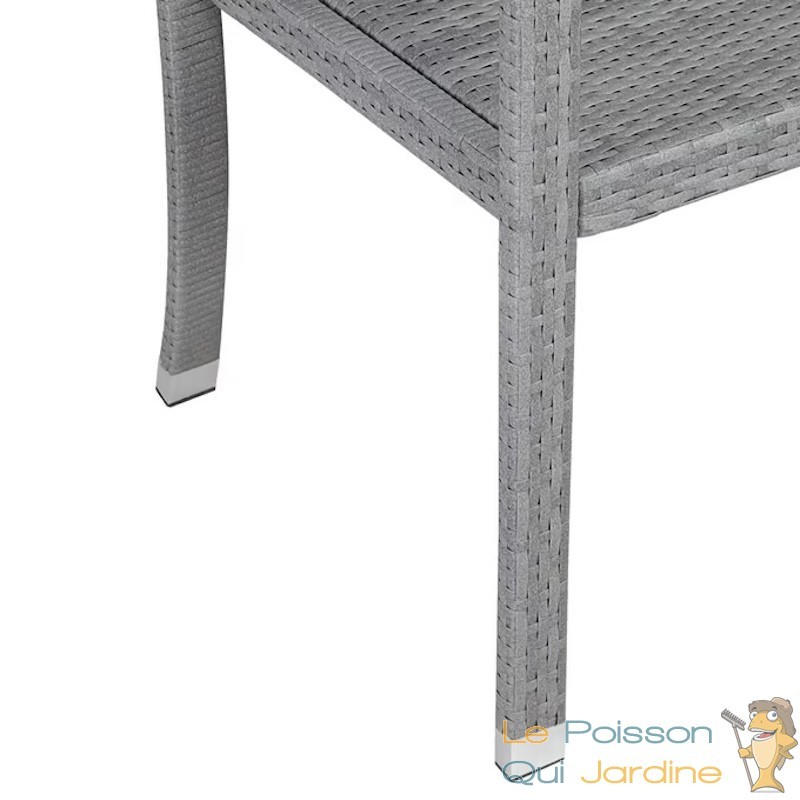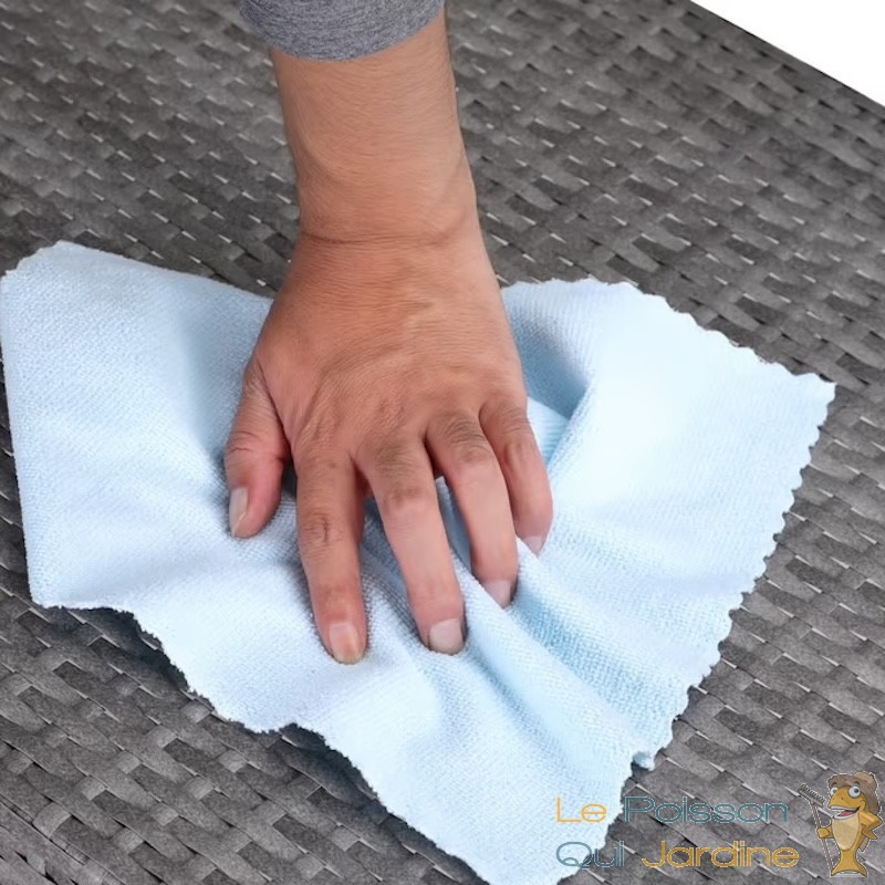 Le polyrotin est hydrofuge et résistant. Un simple nettoyage à l'eau savonneuse au printemps suffit, bien qu'une housse de protection soit conseillée pour garder le mobilier comme neuf.