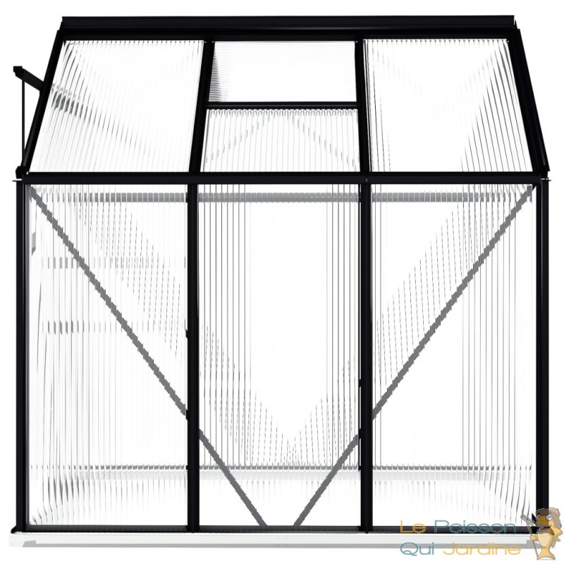 La construction de cette serre repose sur des panneaux robustes en polycarbonate, réputés pour leur résistance aux rayons UV et leur isolation thermique performante. Pour garantir une solidité exceptionnelle, la structure est en aluminium, et le cadre de base est renforcé par quatre profils solides, assurant une grande stabilité. Elle est également dotée d'un système de gouttière qui évacue efficacement l'eau de pluie et d'un évent de toit qui favorise une ventilation optimale par temps chaud. Les panneaux du toit sont sécurisés par des clips métalliques, garantissant ainsi une durabilité à long terme. L'assemblage de cette serre est également un processus simple, facilitant son installation.
