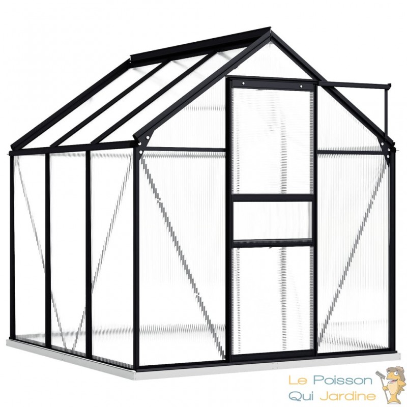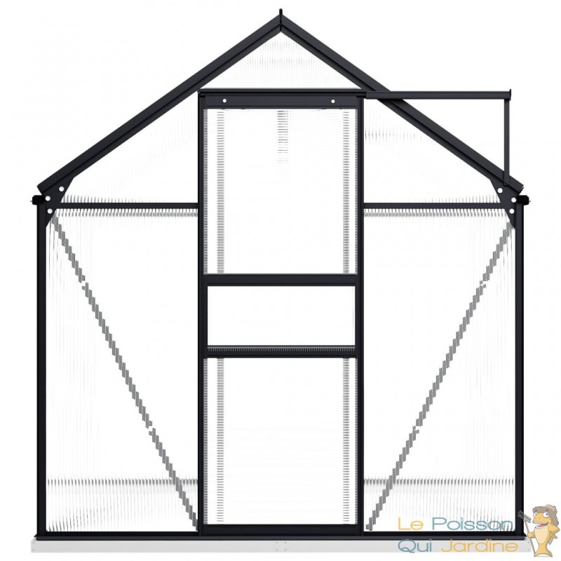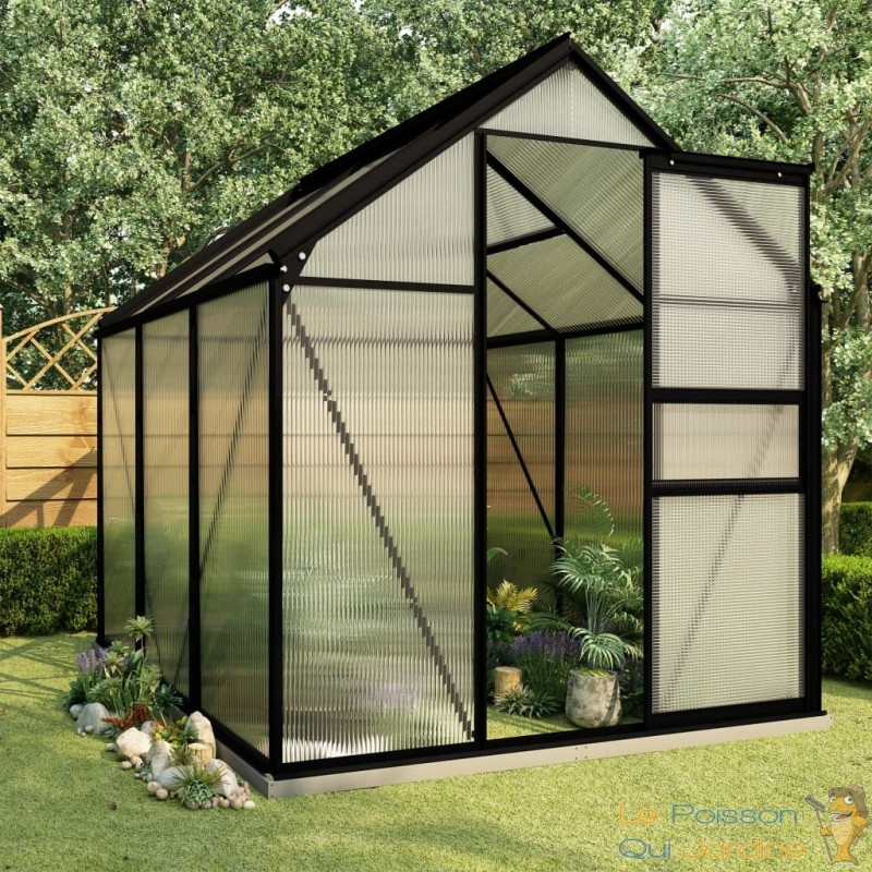 Explorez cette spacieuse serre de jardin, conçue pour accueillir un grand nombre de plantes tout en les protégeant efficacement du froid. Cette serre se distingue par sa couleur anthracite et sa transparence, elle est fabriquée en utilisant des matériaux de qualité tels que l'aluminium et le polycarbonate.