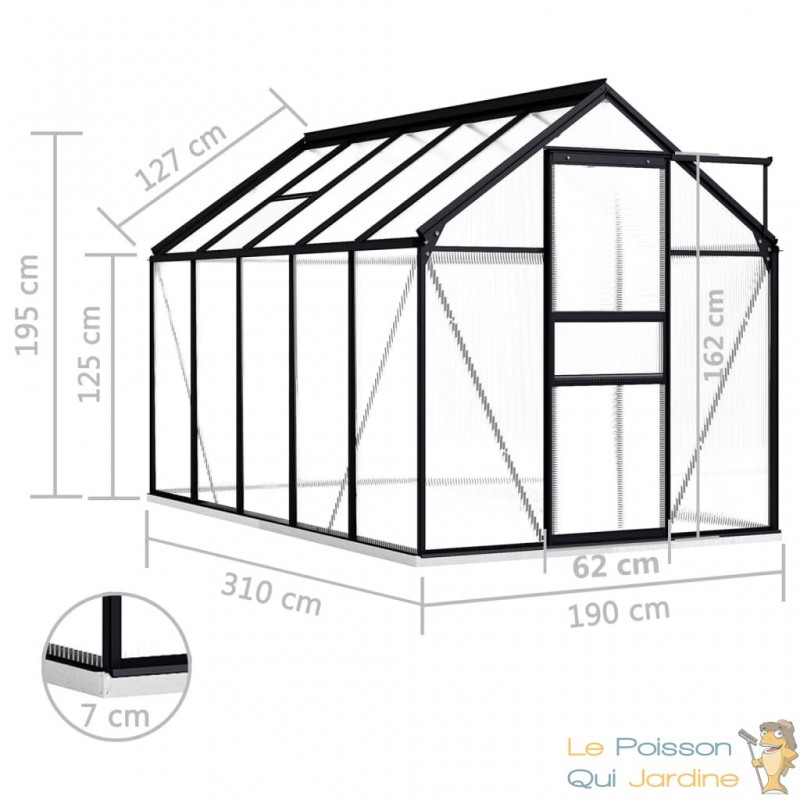 La construction de cette serre repose sur des panneaux robustes en polycarbonate, réputés pour leur résistance aux rayons UV et leur isolation thermique performante. Pour garantir une solidité exceptionnelle, la structure est en aluminium, et le cadre de base est renforcé par quatre profils solides, assurant une grande stabilité. Elle est également dotée d'un système de gouttière qui évacue efficacement l'eau de pluie et d'un évent de toit qui favorise une ventilation optimale par temps chaud. Les panneaux du toit sont sécurisés par des clips métalliques, garantissant ainsi une durabilité à long terme. L'assemblage de cette serre est également un processus simple, facilitant son installation.