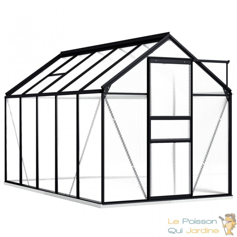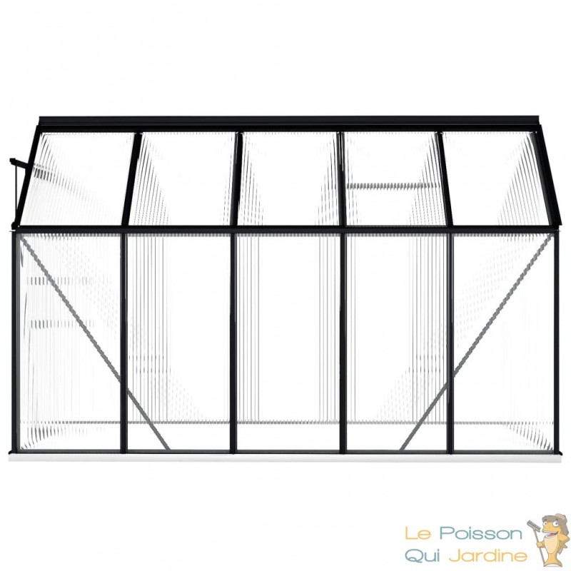 Explorez cette spacieuse serre de jardin, conçue pour accueillir un grand nombre de plantes tout en les protégeant efficacement du froid. Cette serre se distingue par sa couleur anthracite et sa transparence, elle est fabriquée en utilisant des matériaux de qualité tels que l'aluminium et le polycarbonate.
