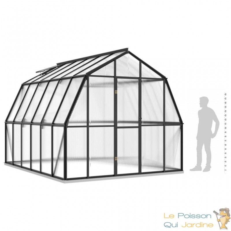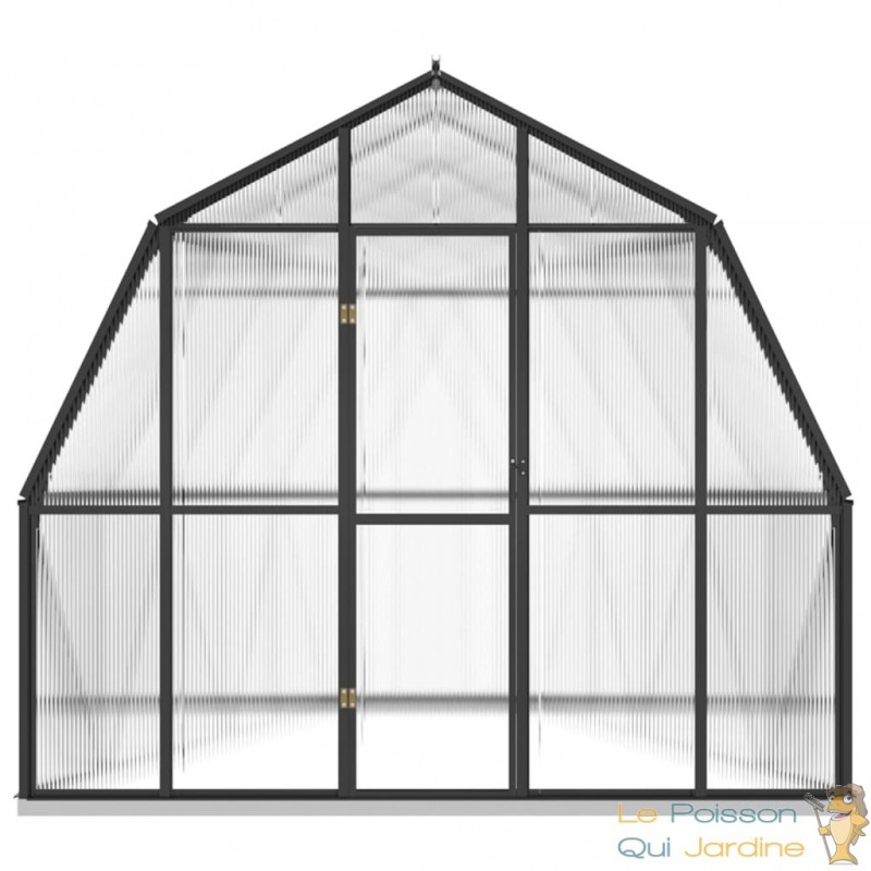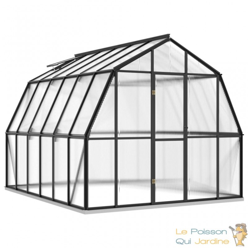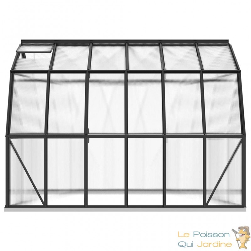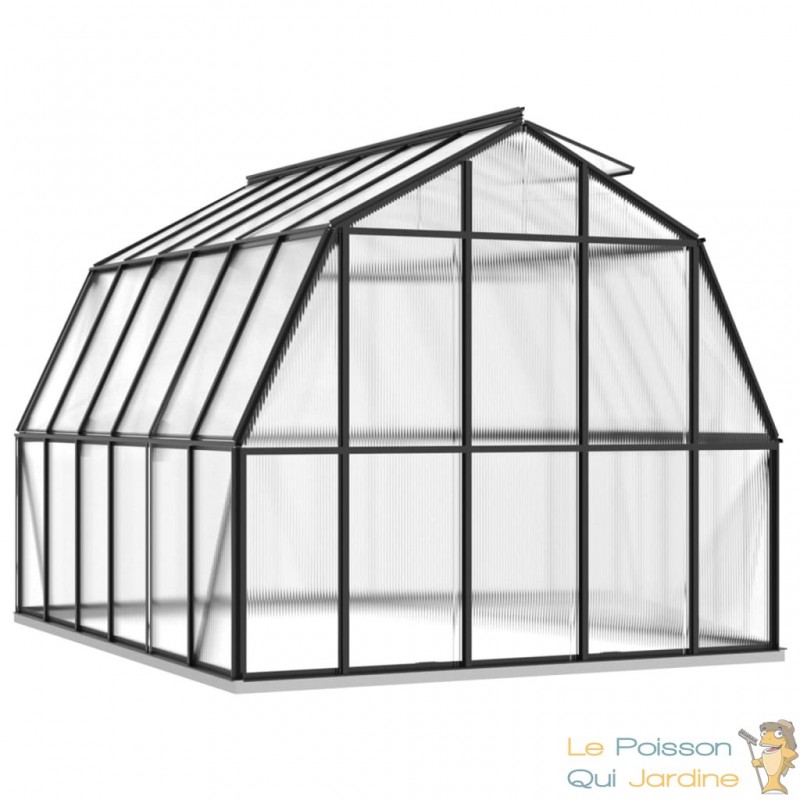 Explorez cette spacieuse serre de jardin, conçue pour accueillir un grand nombre de plantes tout en les protégeant efficacement du froid. Cette serre se distingue par sa couleur anthracite et sa transparence, elle est fabriquée en utilisant des matériaux de qualité tels que l'aluminium et le polycarbonate.