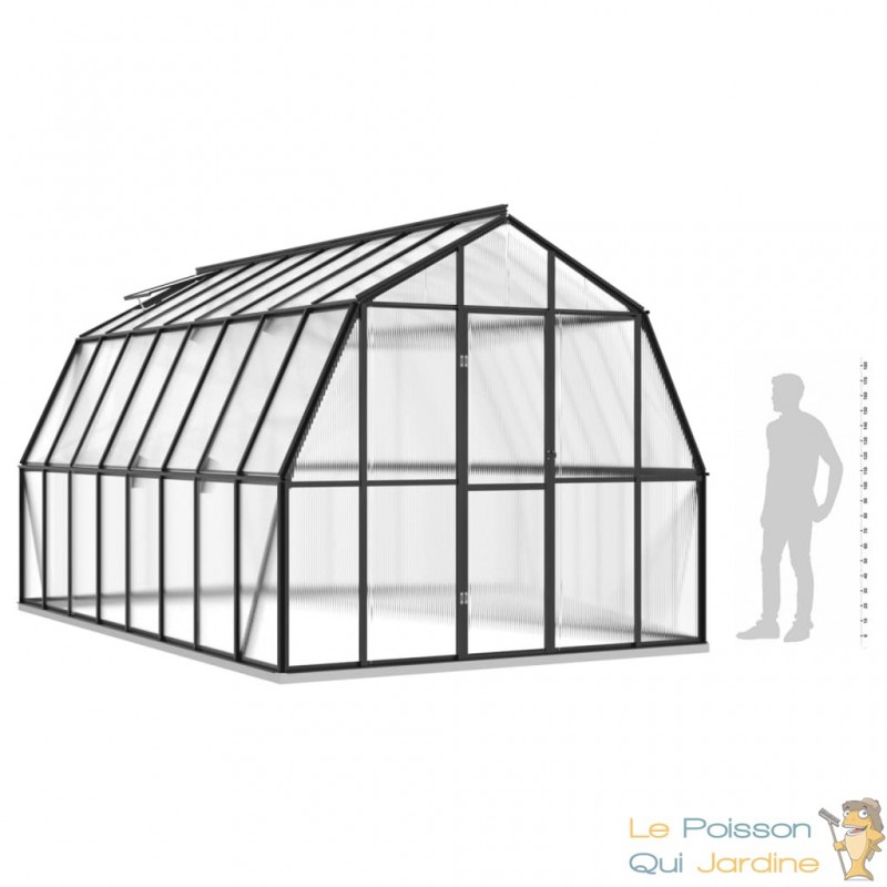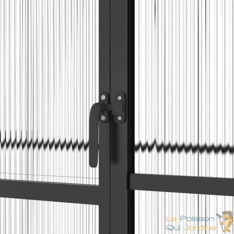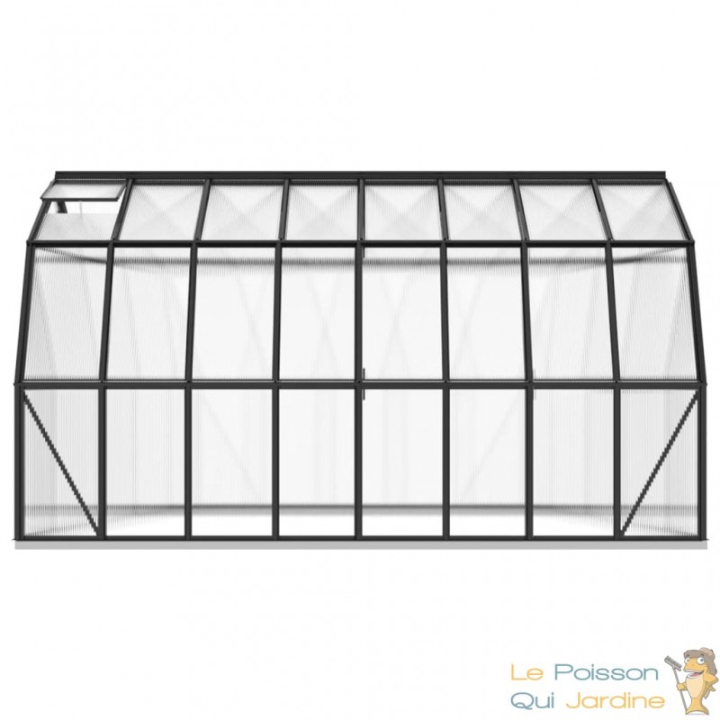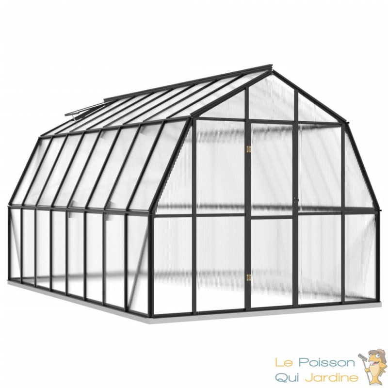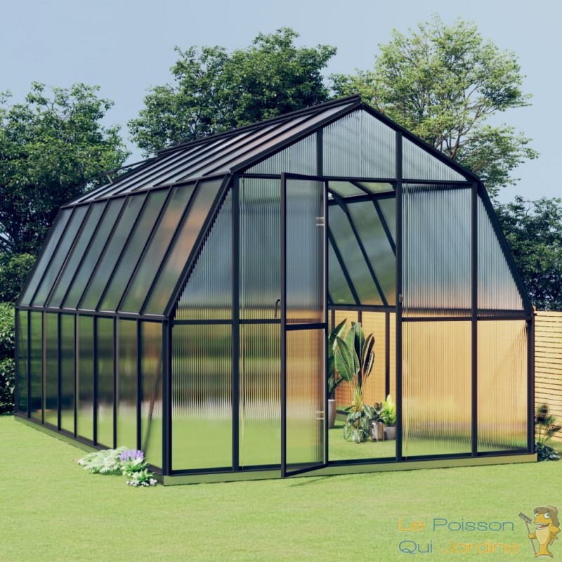 Explorez cette spacieuse serre de jardin, conçue pour accueillir un grand nombre de plantes tout en les protégeant efficacement du froid. Cette serre se distingue par sa couleur anthracite et sa transparence, elle est fabriquée en utilisant des matériaux de qualité tels que l'aluminium et le polycarbonate.