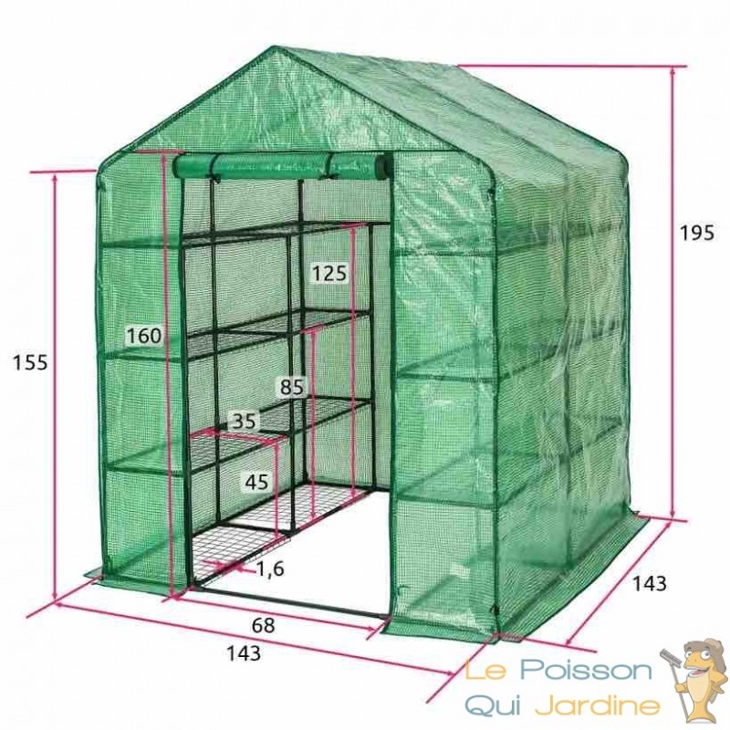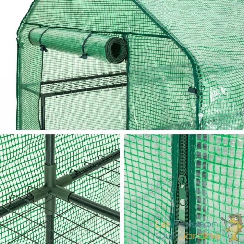 La bâche de la serre est conçue pour laisser passer la lumière du jour tout en maintenant un environnement intérieur optimal en termes d'humidité et de chaleur. De plus, lors des journées particulièrement chaudes, vous avez la possibilité d'ouvrir la porte à l'aide d'une fermeture éclair et de l'enrouler, favorisant ainsi une circulation d'air adéquate.