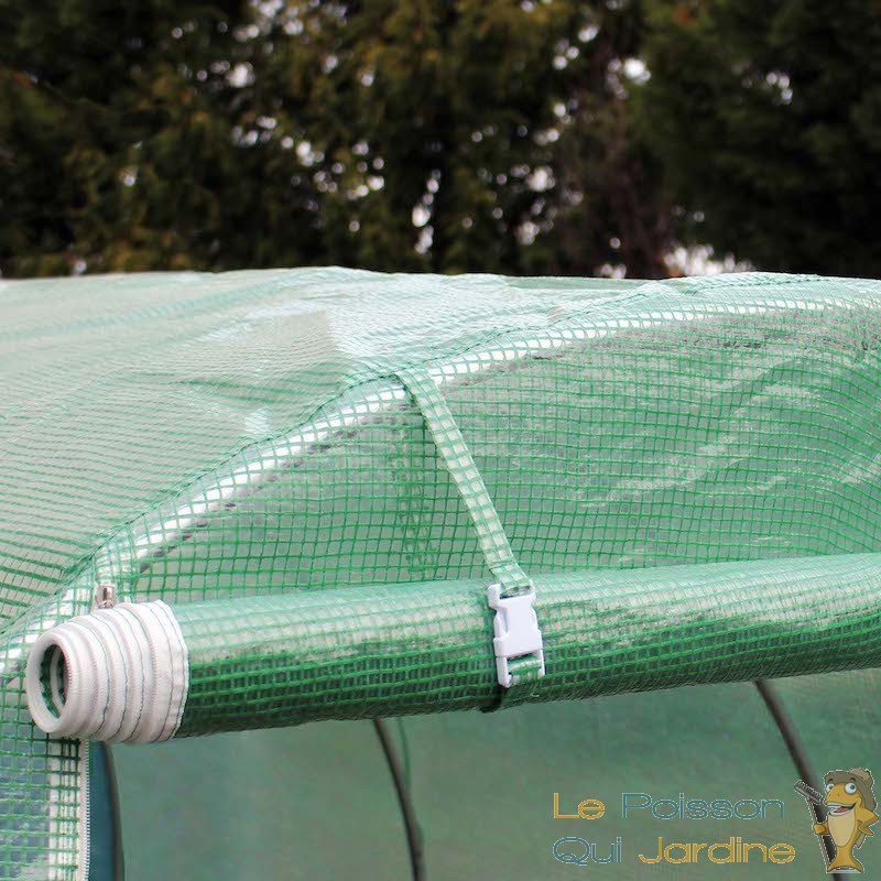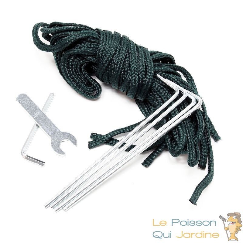 Notons que la bâche de la serre est légèrement plus longue que le cadre, c'est pourquoi il est recommandé de stabiliser le bord avec de la terre ou des pierres, afin d'assurer une stabilité globale optimale. De plus, des cordes et des piquets sont inclus dans la livraison pour garantir une fixation sécurisée de la serre.