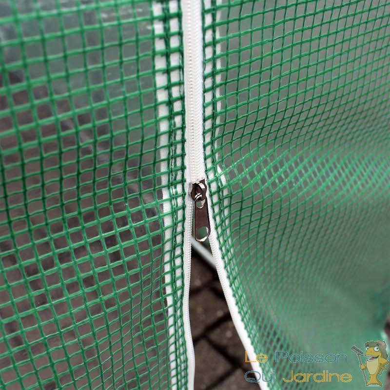 La bâche de la serre est conçue pour laisser passer la lumière du jour tout en maintenant un environnement intérieur optimal en termes d'humidité et de chaleur. De plus, lors des journées particulièrement chaudes, vous avez la possibilité d'ouvrir la porte à l'aide d'une fermeture éclair et de l'enrouler, favorisant ainsi une circulation d'air adéquate.