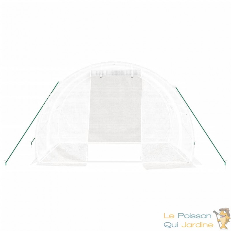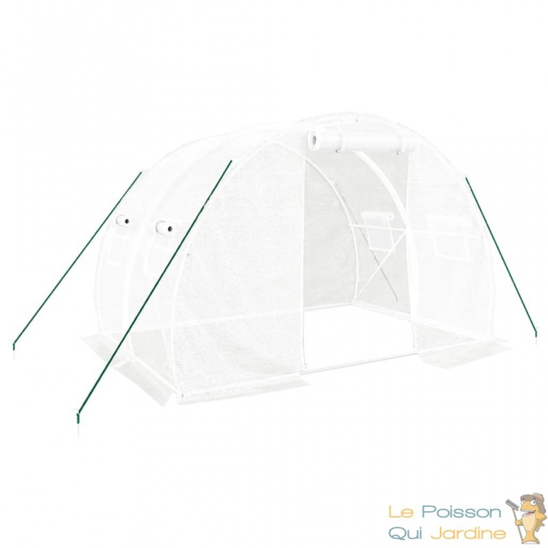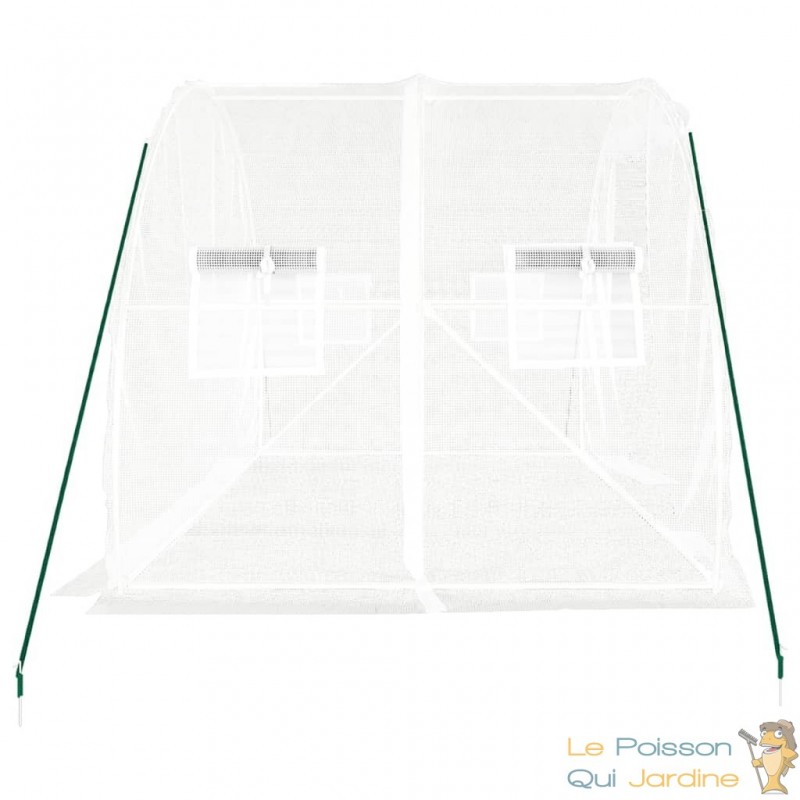 Design pratique : La serre est conçue pour faciliter l'accès et optimiser la circulation d'air grâce à sa porte à enroulement avec fermeture éclair et ses fenêtres latérales en treillis à enroulement.