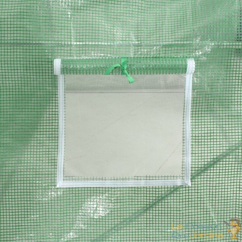 Design pratique : La serre est conçue pour faciliter l'accès et optimiser la circulation d'air grâce à sa porte à enroulement avec fermeture éclair et ses fenêtres latérales en treillis à enroulement.