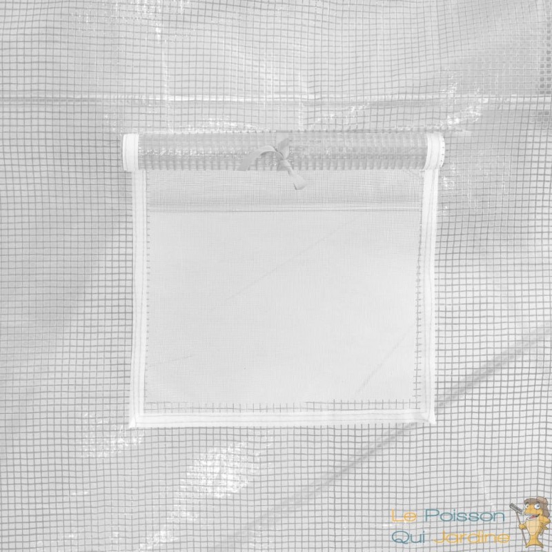 Design pratique : La serre est conçue pour faciliter l'accès et optimiser la circulation d'air grâce à sa porte à enroulement avec fermeture éclair et ses fenêtres latérales en treillis à enroulement.