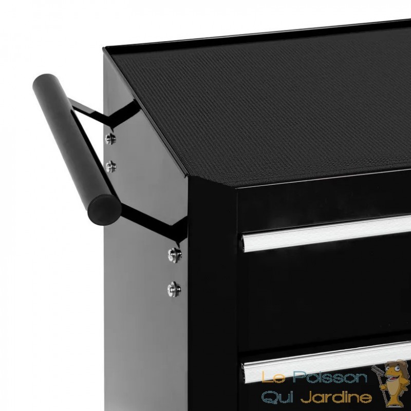 Enfin, la poignée pratique de la servante d'atelier peut être installée à gauche ou à droite selon vos préférences et vos besoins. Cela vous permet d'ajuster la configuration du chariot en fonction de votre position de travail et de votre confort.