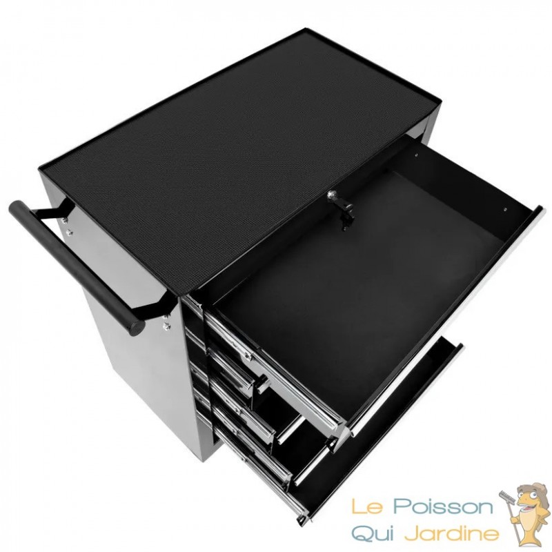 Un autre avantage essentiel est la présence de tapis antidérapants à l'intérieur des tiroirs et sur le plateau du chariot. Ces tapis garantissent que vos outils restent bien en place, même lors de déplacements ou de manœuvres rapides. Fini les outils qui glissent ou s'entrechoquent, grâce à ces tapis pratiques.