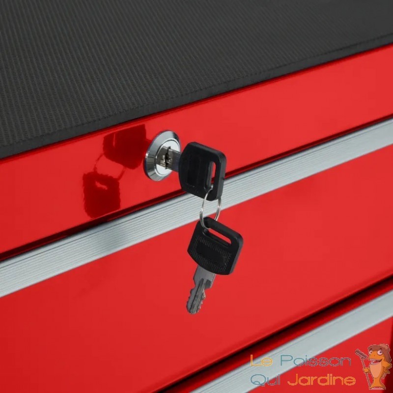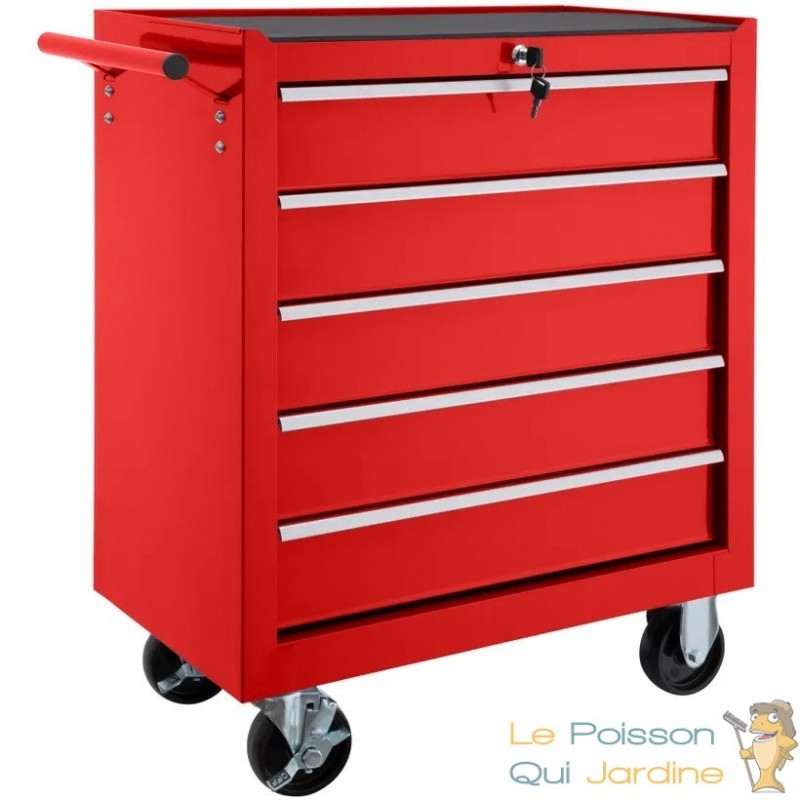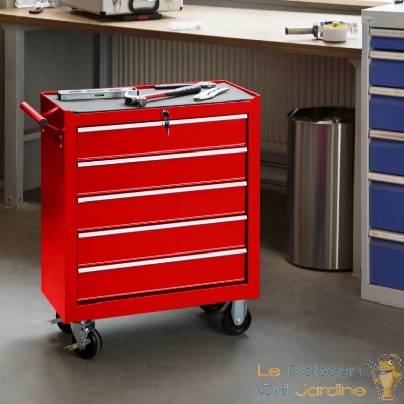 Chaque détail de cette servante d'atelier a été soigneusement pensé pour offrir une expérience d'utilisation pratique et efficace. Les 5 tiroirs spacieux offrent suffisamment d'espace pour ranger une variété d'outils, des plus petits aux plus grands. Grâce à leur verrouillage sécurisé, vous pouvez être sûr que vos outils seront en sécurité, que vous soyez en déplacement ou que vous les laissiez sans surveillance.