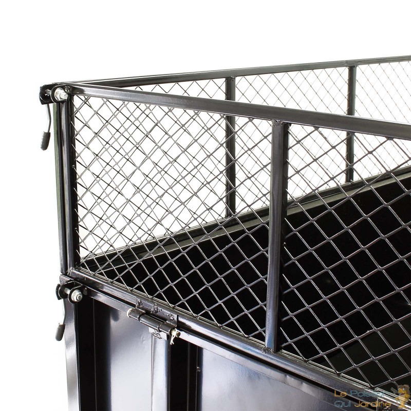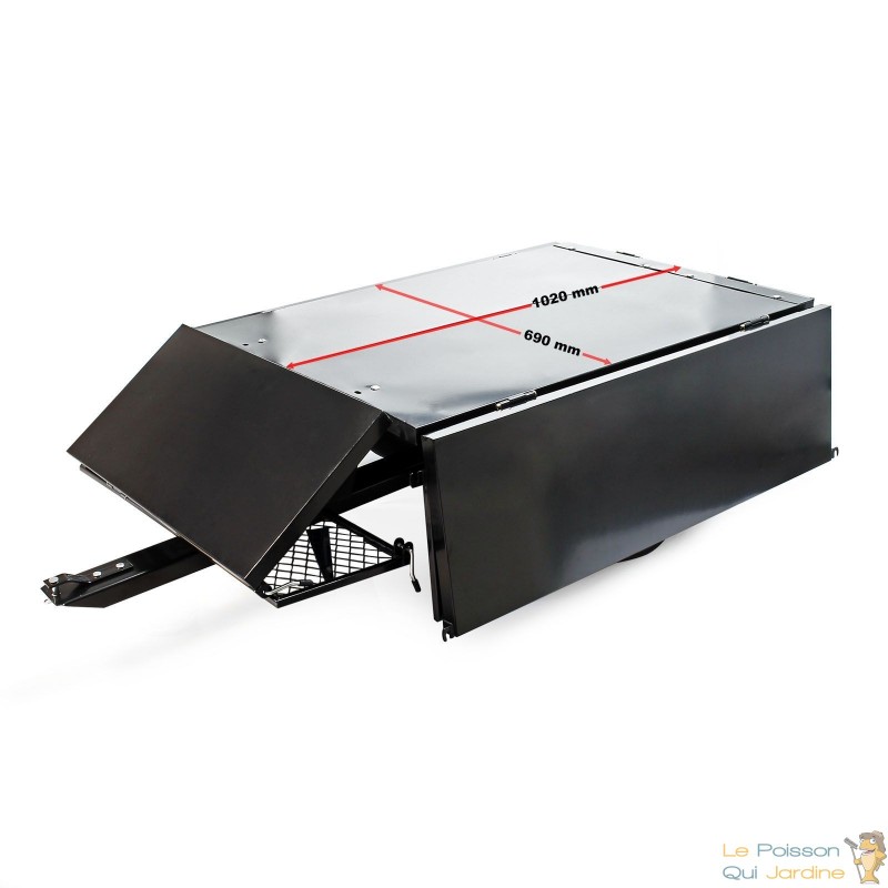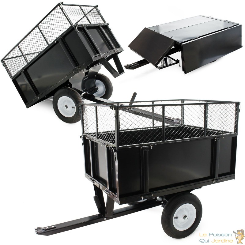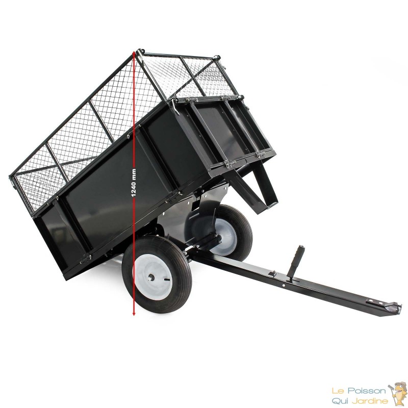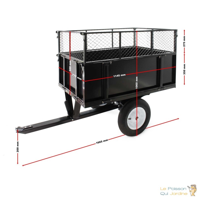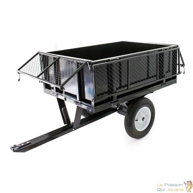 Une remorque basculante de 114x76x30 cm, équipée d'une grille et de parois amovibles, est un accessoire essentiel pour les tondeuses autoportées.
