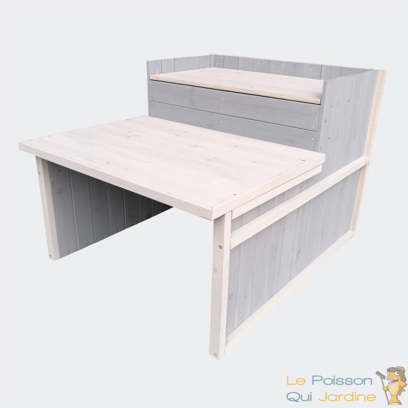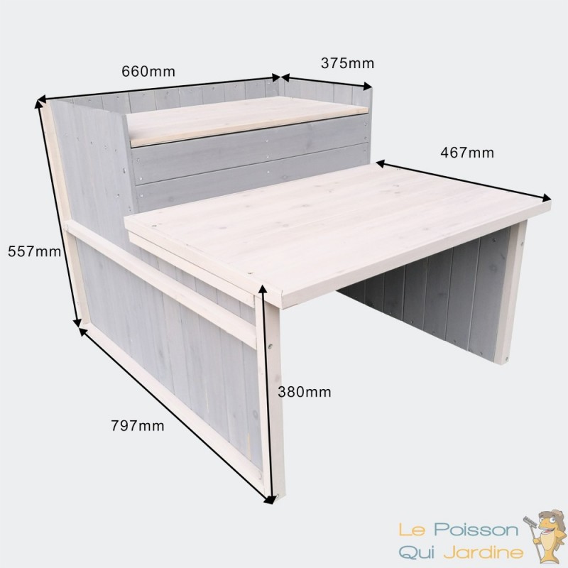 Matériaux : Bois, traité contre les intempéries et l'humidité et revêtement étanche sur le toit. N'hésitez pas à le traiter chaque année pour une durabilité importante et accrue pendant de longues années.
