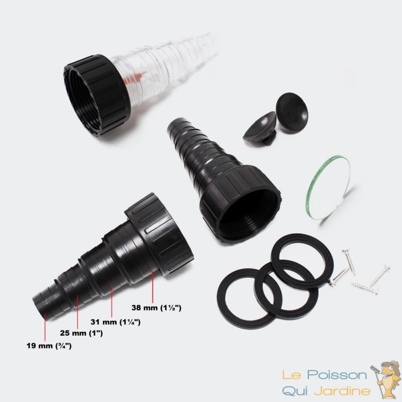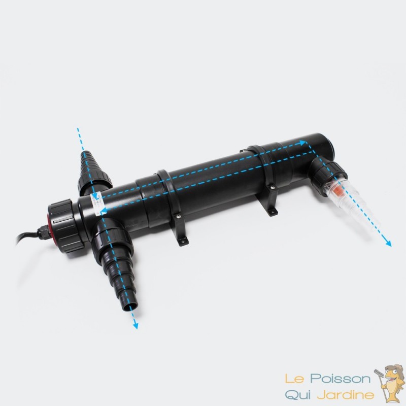 Notre UV stérilisateur est fourni avec une ampoule et des embouts de différentes tailles afin de connecter des tuyaux de 20 - 25 - 32 ou 40 mm.