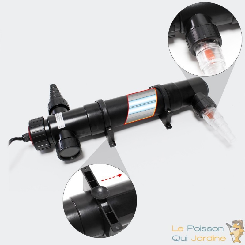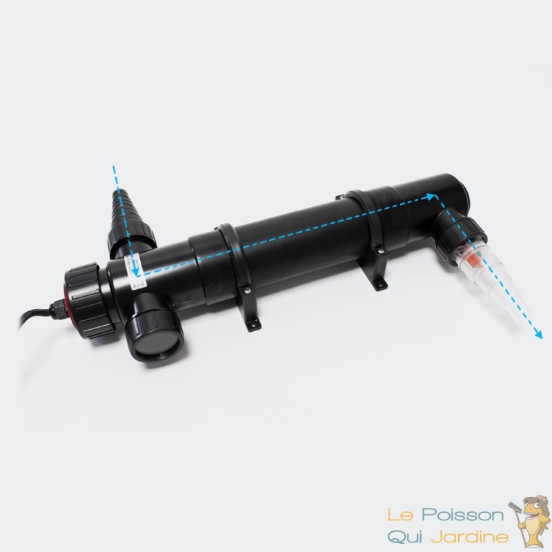 Le fonctionnement de l' appareil UV est simple. Une pompe de bassin de jardin envoie de l'eau dans une des entrées de l'UV. L'eau tourne autour de la gaine de quartz qui entoure l'ampoule UV. L'eau ressort stérilisée.