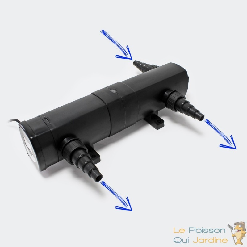 Le fonctionnement de l' appareil UV est simple. Une pompe de bassin de jardin envoie de l'eau dans une des entrées de l'UV. L'eau tourne autour de la gaine de quartz qui entoure l'ampoule UV. L'eau ressort stérilisée.