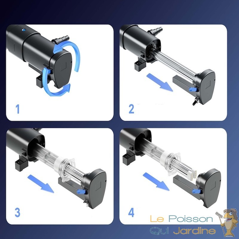 Même si la lampe brille encore, elle perd son pouvoir de rayonnement UV après environ 8 000 heures (une saison complète). Nous recommandons de changer vos deux lampes de 55 W chaque année au printemps, dès que la température atteint 12-15°C, pour prévenir la poussée d'algues.