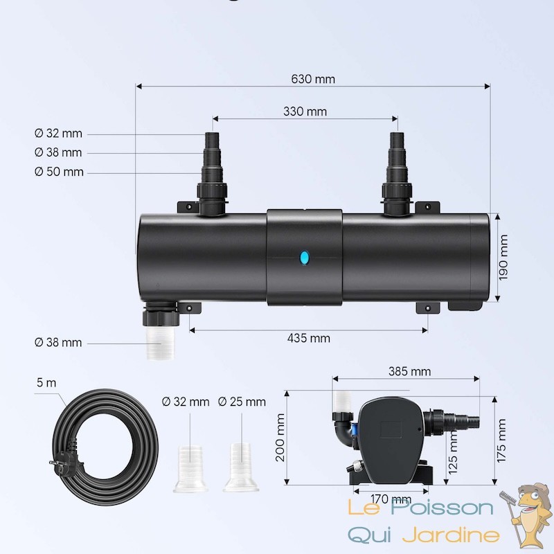 Les carpes Koï produisent beaucoup de déchets organiques. Pour ces poissons exigeants, on compte 3 W par m³. Ce modèle de 110 W est donc idéal pour un bassin à Koï d'environ 35 à 40 m³. Pour un bassin d'agrément sans poissons, il peut traiter jusqu'à 50 m³ sans difficulté.
