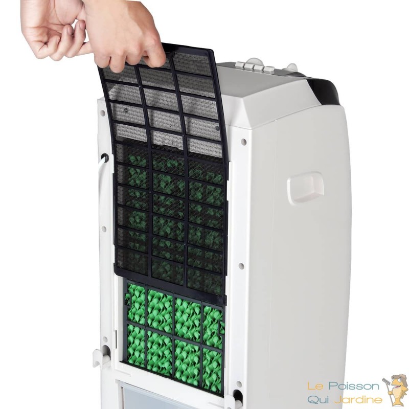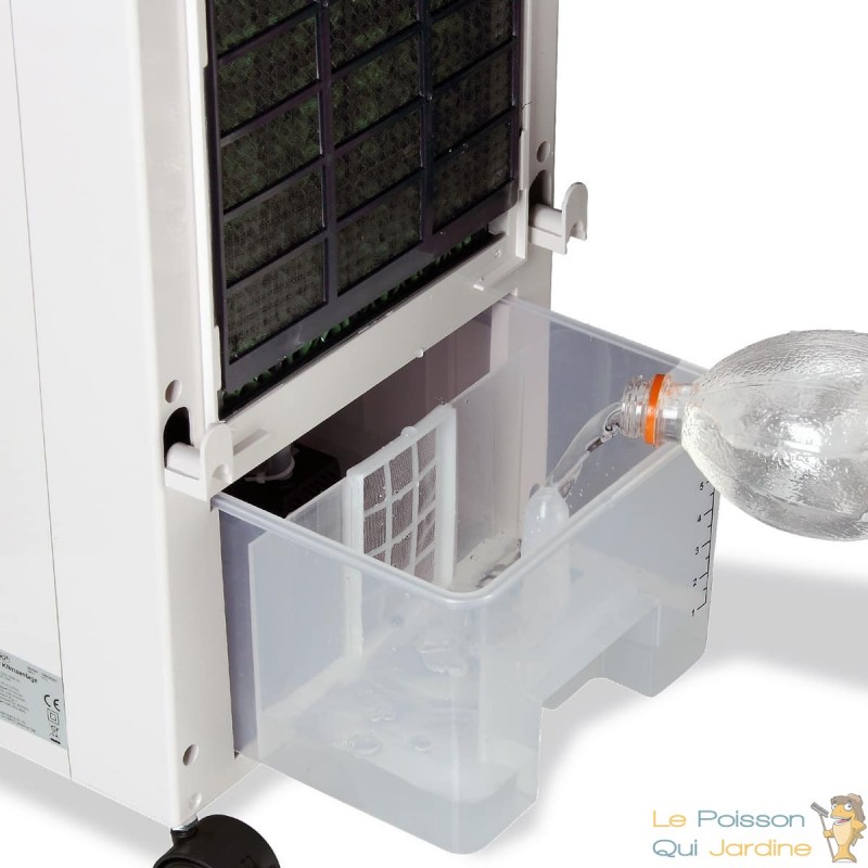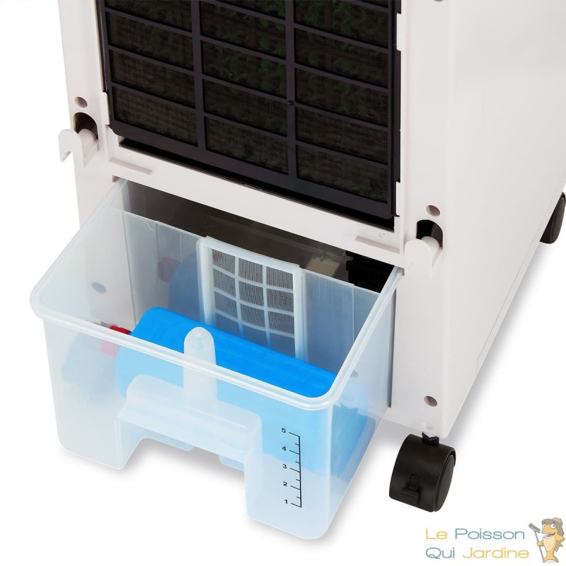 Son réservoir d'une capacité généreuse de 5 litres et son système d'évaporation d'eau avancé garantissent un flux d'air frais et une humidification douce de l'air ambiant. Vous pouvez ainsi profiter d'une atmosphère fraîche et bien humidifiée, parfaite pour les journées chaudes. De plus, l'appareil est équipé d'un système de filtre eau et poussière intégré qui assure un nettoyage efficace de l'air en capturant les particules indésirables, vous offrant ainsi un environnement plus sain.