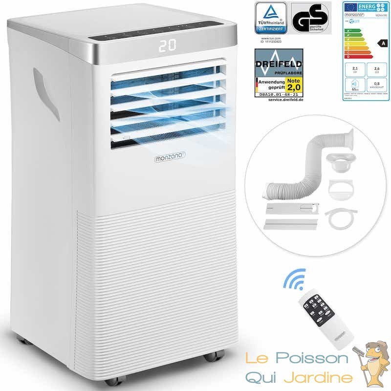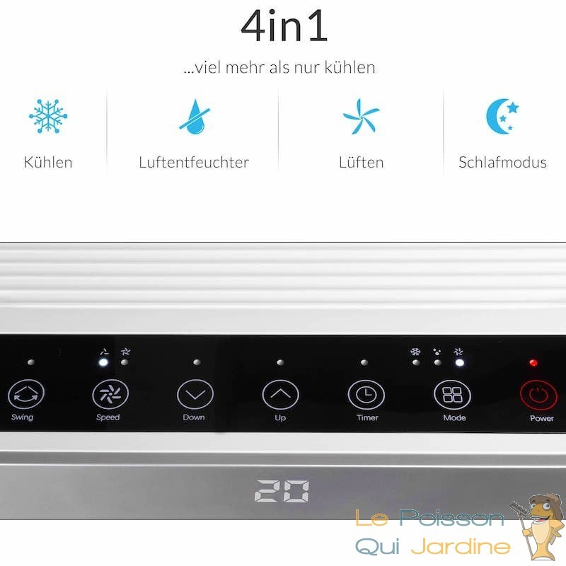 Les avantages de ce climatiseur incluent son débit d'air de 360 m³ par heure, sa certification de sécurité GS geprüfte Sicherheit - TÜV Rheinland, son grand panneau de commande avec écran tactile, ses 4 modes (rafraîchissement, déshumidification, ventilation, mode nuit), sa minuterie de 24 heures, sa télécommande incluse, ses 4 roulettes à 360°, sa fonction de déshumidification séparée avec une capacité maximale de 19,2 L/24 h, son utilisation du fluide frigorigène écologique R290, ses ailettes réglables pour une répartition optimale de l'air, sa puissance de ventilation réglable, son réglage de température de 16 °C à 32 °C, ses 2 poignées, son filtre anti-poussière et anti-insectes, ses nombreux accessoires tels que le kit de montage complet avec tuyau et adaptateurs pour l'évacuation de l'air chaud, ainsi que son corps résistant en plastique ABS. De plus, il est équipé d'une fonction de dégivrage automatique en cas de température trop basse.