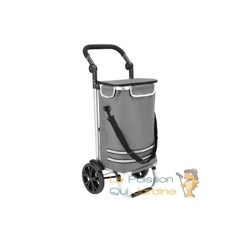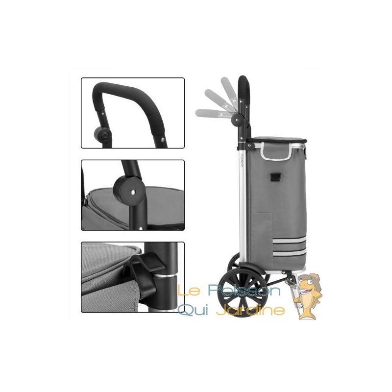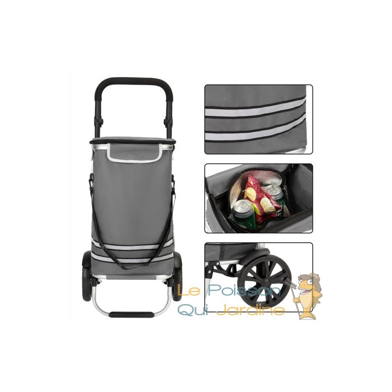 Les avantages de ce produit sont nombreux, notamment sa capacité à se plier pour un rangement facile, sa robustesse, sa poignée réglable, ses bandes auto-réfléchissantes pour plus de sécurité, son compartiment isotherme pour les produits réfrigérés, sa poche pour parapluie, son sac amovible, ses roues en caoutchouc et sa structure légère en aluminium équipée de roulements à billes pour une utilisation aisée.