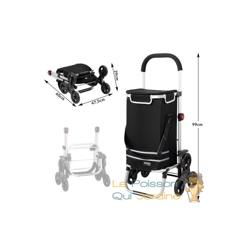 Les avantages de ce produit sont nombreux, notamment sa capacité à se plier pour un rangement facile, sa robustesse, sa poignée réglable, ses bandes auto-réfléchissantes pour plus de sécurité, son compartiment isotherme pour les produits réfrigérés, sa poche pour parapluie, son sac amovible, ses roues en caoutchouc et sa structure légère en aluminium équipée de roulements à billes pour une utilisation aisée.